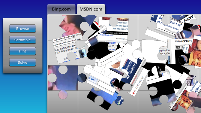This is the main user control that loads the WebBrowser control or the puzzle (through the HtmlPuzzle control). It has a button which toggles the state for the HtmlPuzzle control between the WebBrowser control (the Browse button) and the puzzle ( the Puzzlify button).