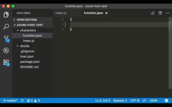 Azure Functions can be configured a few ways. One of the most flexible is to use JSON files. This extension handles providing intellisense for the key configuration files in Azure Functions: function.json and host.json.
