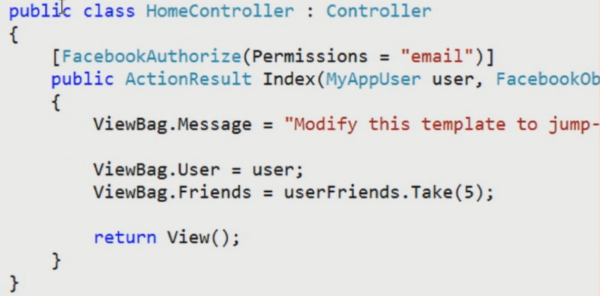 They've added a new Facebook C# SDK NuGet package that makes it much simpler to access Facebook auth. So what can you do? You can add the Facebook Authorize attribute to a controller action so it will bounce you over to Facebook's auth and request specific types of permissions/access (like email, friends, etc). You can also grab a Facebook user and bind it to a local class and gain access to Facebook apps.