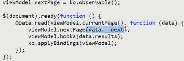 The returning JSON also adds in a small link to the next 5 records (this is baked into the JSON response). You can use the OData querystring to get the "next x" records or you can use a special method they expose in the results called __next (that is underscore underscore next) like this: