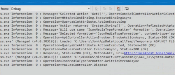No longer are your Web API calls a mystical creature that is difficult to trace when something goes amiss. You can now see the tracing of your Web API calls in the debug window of Visual Studio. Very helpful to see what's actually happening as you run your apps and browse around. It does this with the SystemDiagnosticsTraceWriter class.